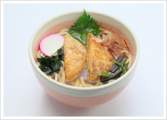 豊川いなりうどんの代名詞の「いなり餅」は醤油ベースの味付で甘辛風味。また、中に入っているお餅は一つ一つ手作業で詰めています。丁寧に作られた「いなり餅」は口の中でしっかりと伸びて、お餅本来の味が楽しめます。つゆの味付けもしっかりとしており、「いなり餅」の味に負けず劣らず絶妙なバランスに仕上がっています。大葉は生を使用。